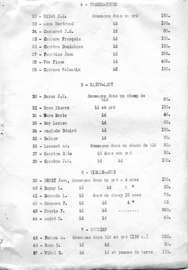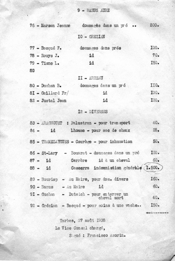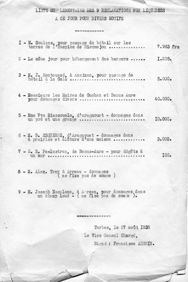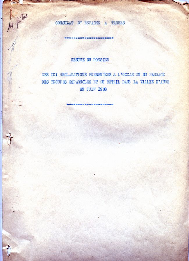 Contenido: Resumen del dossier de reclamaciones de daños producidos por el paso en el Valle del Aure (Altos Pirineos, Francia) de las tropas españolas en junio de 1938. Firmado por Francisco Azorín, vice cónsul el 27 de agosto de 1938 en Tarbes. 6 páginas. Documento en máquina de escribir y en francés. Lo facilitó al Sr. Verdier el Sr. Ribes, profesor en Saint-Lary.