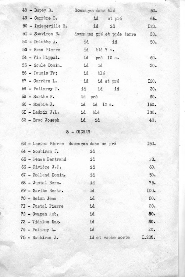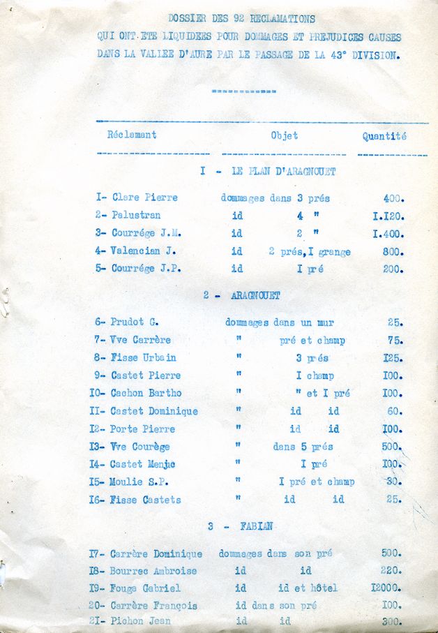 Reseña: Listado de 92 reclamaciones pagadas por daños y perjuicios producidos en el valle del Aure durante el paso de la 43 DV. Están numerados y ordenados por poblaciones más un apartado de diversos; los datos están organizados en 3 columnas con el nombre del propietario, el daño causado y su valoración en francos. |