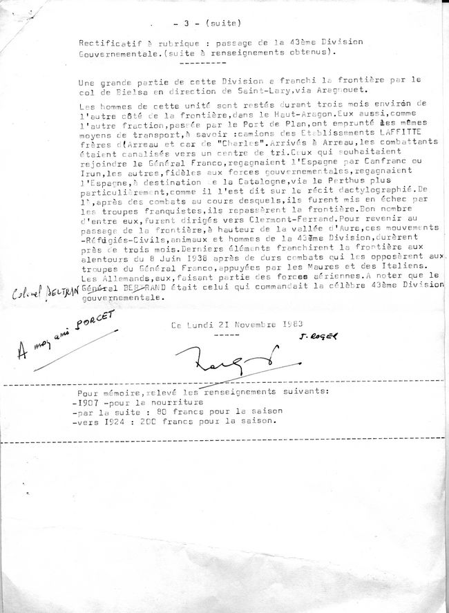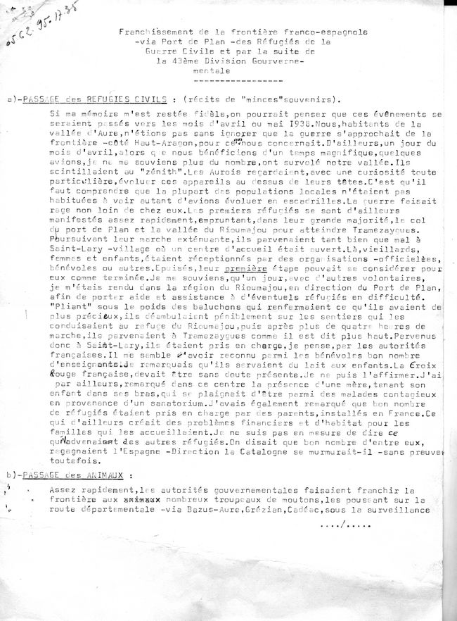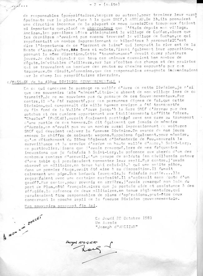 Reseña: Las dos primeras páginas hace un resumen de sus ‘escasos’ recuerdos en tres partes: a/Paso de refugiados civiles; b/Paso de los animales; c/Paso de la 43 DV gubernamental. Después de la firma escribe una tercera página en la que añade más recuerdos. Explica que él participa con otros voluntarios en la ayuda a los refugiados en el mismo paso de Rioumajou, que ayudan organizaciones, voluntarios e instituciones y que hay un centro de acogida en Saint-Lary. Recuerda que algunos son acogidos por familiares y que otros vuelven a España por Irún o Cataluña, según el bando. Sobre los animales que entran desde España, recuerda que los grandes rebaños ocupan varios kilómetros cuando los bajan en dirección a la estación de Arreau, que los llevan de vuelta a España y que causaron daños pero que les dijeron que los pagarían las autoridades españolas. De la 43 DV recuerda que pasaron unos 10.000 hombres y que los llevaron de Saint-Lary hasta la estación en camiones y autobuses de las empresas de la zona y que tuvieron que poner unos 60 vagones en el tren para llevarlos de vuelta a España. También recuerda que actuó de ayuda o apoyo el ejército francés, el 18º Regimiento de Infantería de Pau.