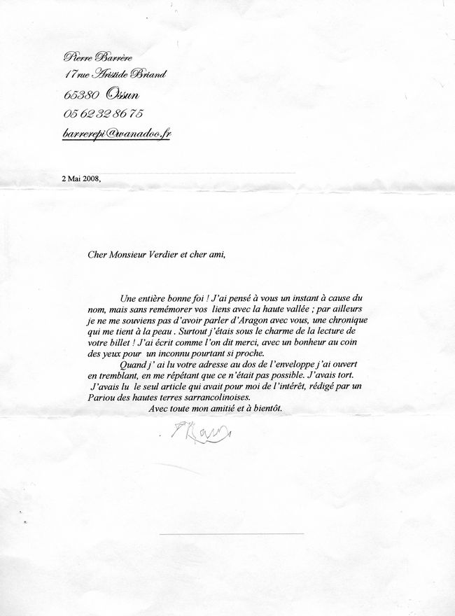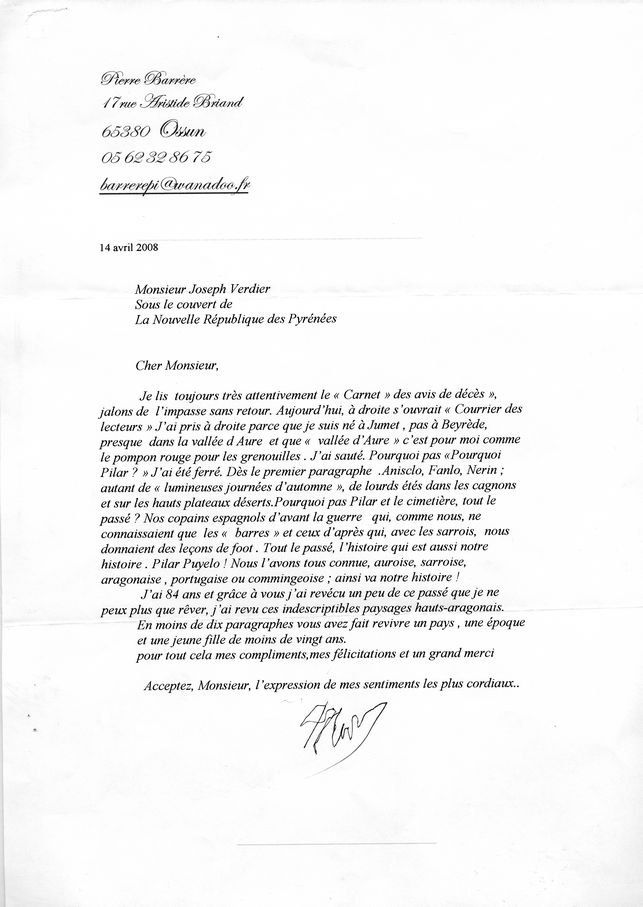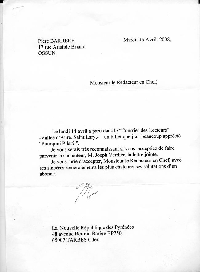 Nota: Este artículo de prensa va acompañado por tres cartas de un lector del periódico Le Nouvelle Republique des Pyrénées de La Depeche du Midi que ha leído el artículo de Josesh Verdier ‘Pourqoi Pilar?’ Una carta enviada al director del periódico y dos cartas que envía a Joseph Verdier sobre el artículo.
