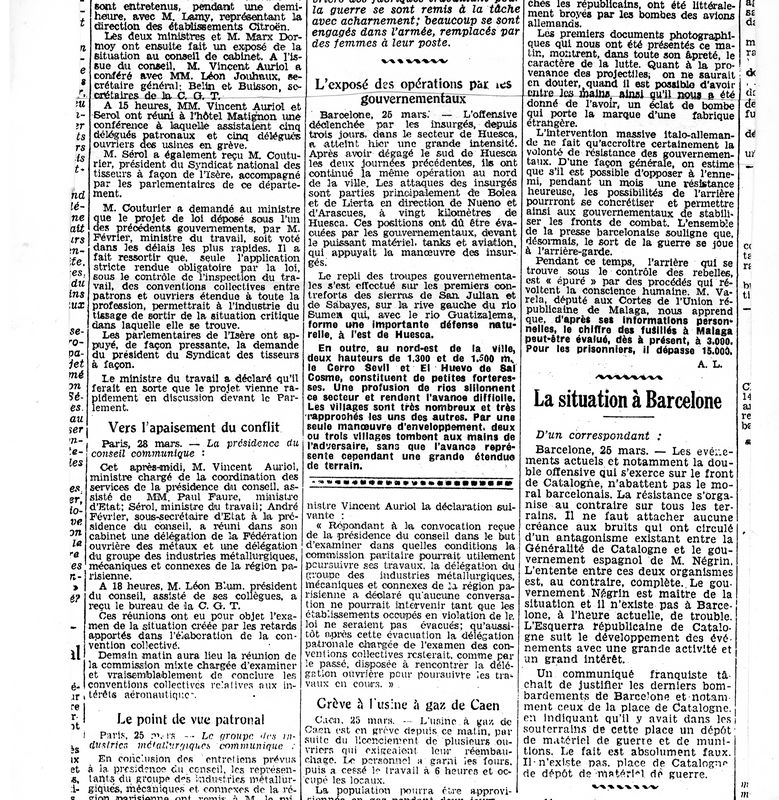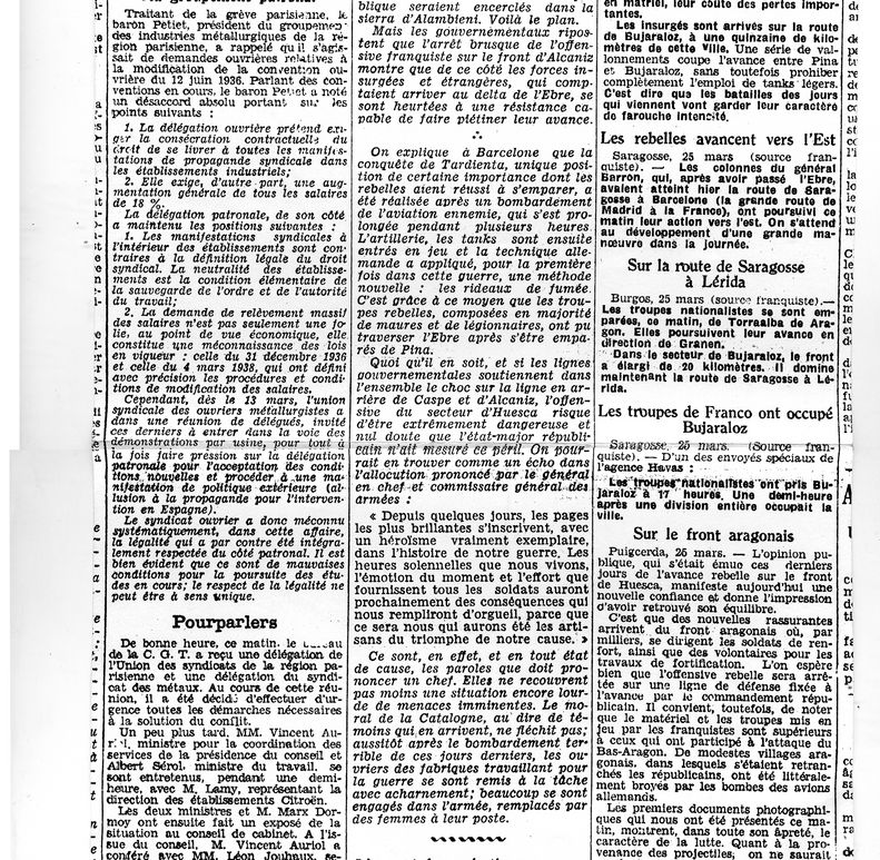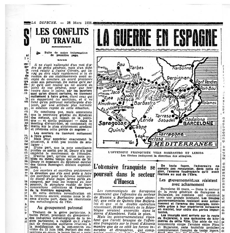 | Contenido: Artículo de prensa francesa del periódico regional 'La Dépêche' sobre la guerra civil, el frente en Aragón y Cataluña y del avance de las tropas nacionales. |