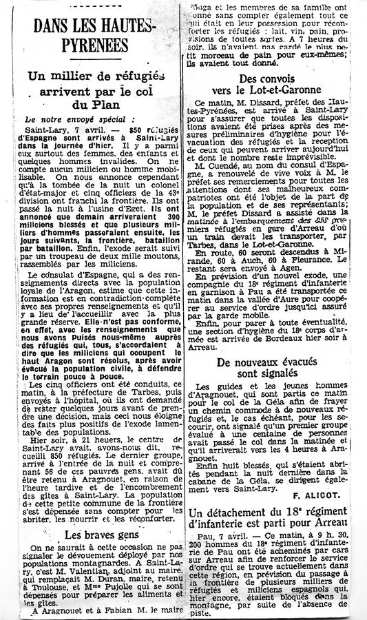 | Contenido: Artículo de prensa sobre el paso de población civil desde Aragón a Francia por el puerto de Bielsa procedentes de varias poblaciones de la zona ocupada por la 43 DV y de las actuaciones de las autoridades francesas. |