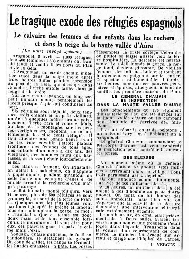 | Contenido: Artículo de prensa sobre el paso de población civil desde Aragón a Francia por el puerto de Bielsa o de la Gela, procedentes de las poblaciones de la zona ocupada por la 43 DV y de las actuaciones de las autoridades francesas.