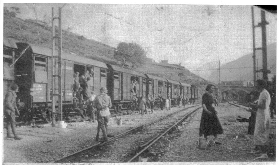 | Contenido: Imagen de un artículo de prensa sin localizar ni el medio ni la fecha, aunque posiblemente haga referencia al embarque de la 43 DV republicana en la estación de Arreau (Hautes-Pyrénées), de vuelta a la zona republicana por Barcelona en junio de 1938. |