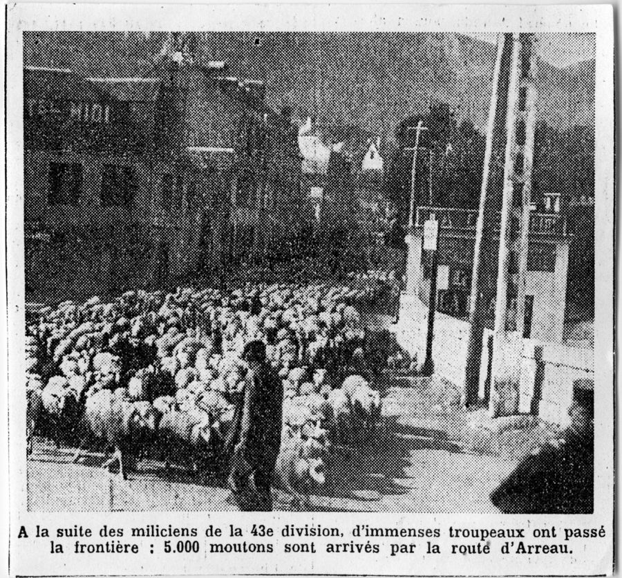 Contenido: Breve nota de prensa con imagen, posiblemente de La Dépêche, sin fecha, sobre la evacuación de los rebaños de ganado que la 43 DV pasaba a Francia para que no quedaran en terreno conquistado. Estos rebaños eran conducidos a la estación de ferrocarril de Arreau (Hautes-Pyrénées), para su traslado en tren a Barcelona. La imagen corresponde a la entrada de un rebaño de ovejas en Arreau. En el pie de foto Después de los milicianos de la 43 DV, inmensos rebaños de ganado han pasado la frontera: 5.000 ovejas han llegado por la ruta de Arreau. Según las notas de Joseph Verdier el 21 de junio de 1938 los servicios veterinarios del estado francés reconocen en un solo día: 2.182 bovinos, 15.630 ovinos y 250 caballerías. |