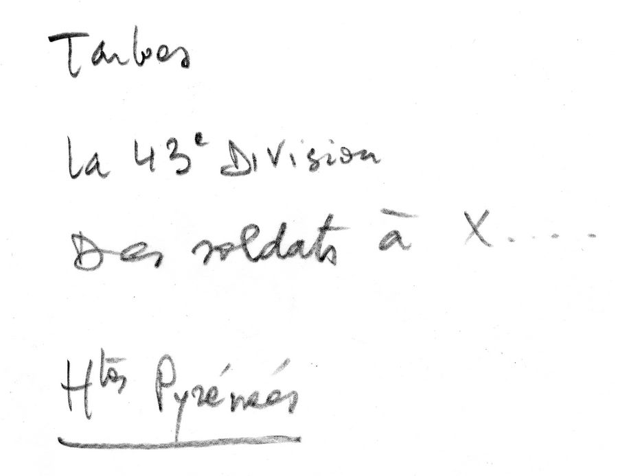 La nota manuscrita en el reverso: Tarbes, la 43 DV, soldados en X... Altos Pirineos. |