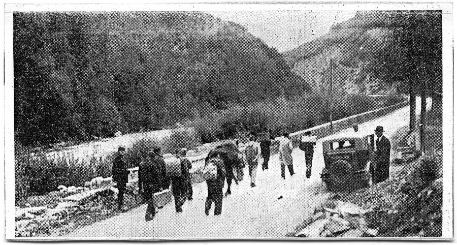 | Contenido: Imagen de prensa, posiblemente del periódico La Dépêche, aunque sin fecha sería también, como el anterior, de los días 14 al 16 de junio, sobre el paso de los milicianos a Francia. En esta imagen varios bajan andando en el tramo de carretera entre Fabian y Saint-Lary, camino de Arreau desde donde después tomarían el tren hacia Cataluña. |
