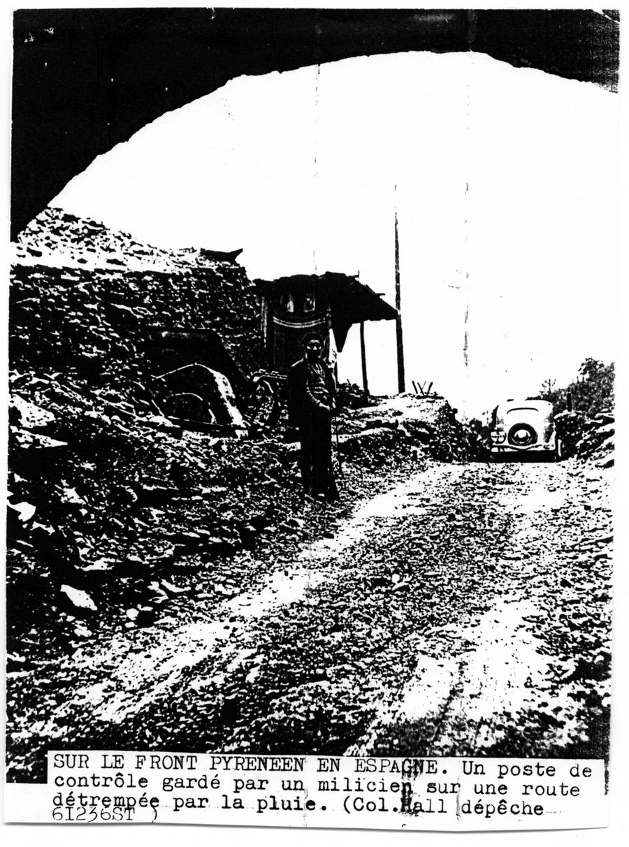 | Contenido: Artículo de prensa del periódico La Dépêche, sobre un puesto fronterizo sin identificar en el Pirineo. Según la nota: Puesto de control vigilado por un miliciano, en una carretera embarrada por la lluvia. Sin fecha. |