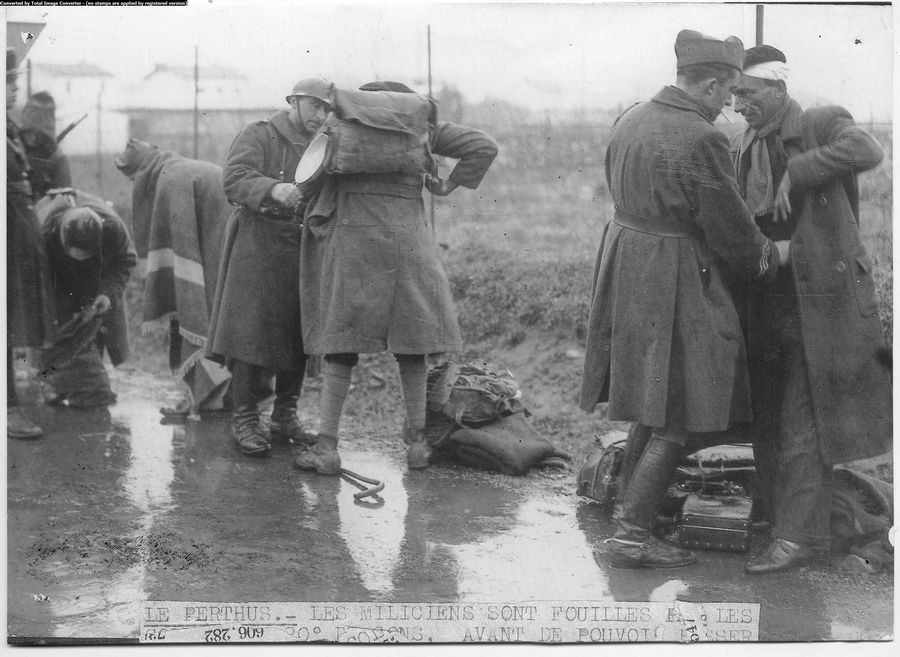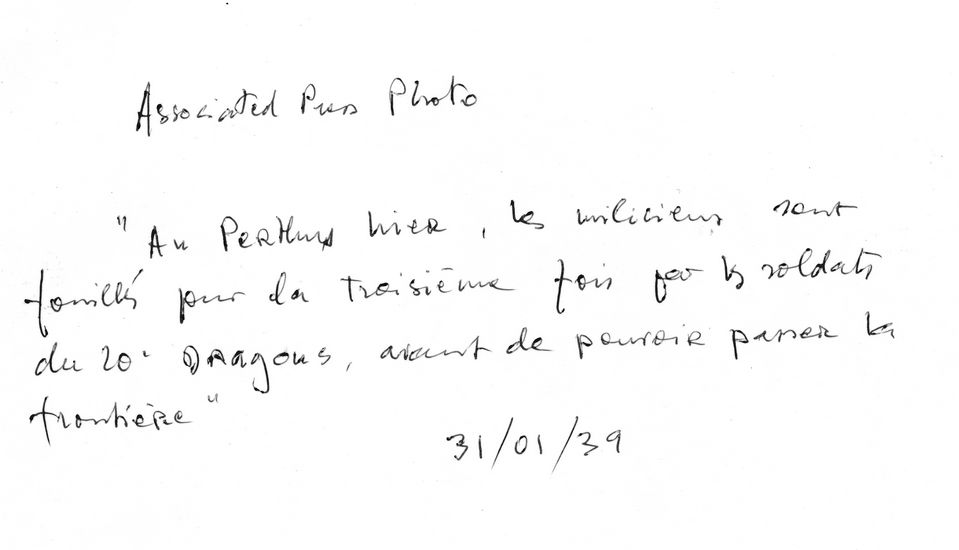 | Contenido: Artículo de prensa, posiblemente como el anterior del periódico La Dépêche, sin fecha, aunque con texto en el reverso manuscrito del Sr. Verdier que corresponde con el texto mecanografiado de la foto: En Perthus ayer, los milicianos son registrados por 3ª vez por los soldados del 20º de Dragones, antes de poder pasar la frontera. 31/01/39, foto de Associated Press Photo. |