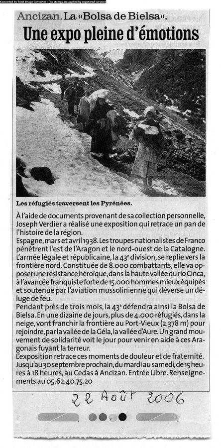 | Contenido: Breve reseña de un medio francés sobre la exposición de la Bolsa de Bielsa en el centro cultural CEDAS en la población francesa de Ancizan, próxima a Arreau (Altos Pirineos). 22 de agosto de 2006 |