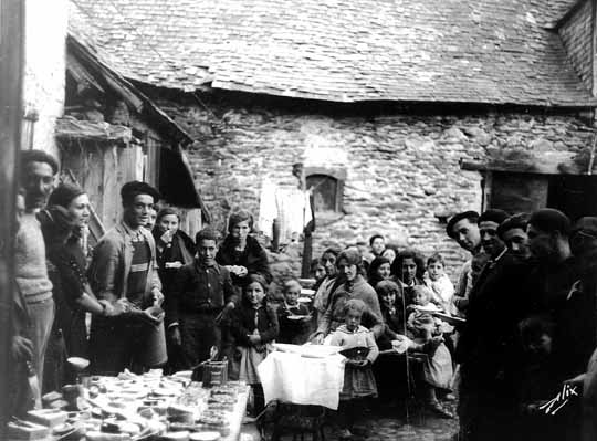 Información de la imagen facilitada por el Sr. Verdier de Saint Lary: Comida en el patio de casa Docuing en Saint Lary. En el lado izquierdo de la imagen, primero Antonio Bielsa, María Bielsa y Jean Cascarra, en el centro el grupo de españoles. A la derecha de la imagen de fuera hacia el centro: Joseph Burgalat, Lucien André, Pierre Mir y François Cascarra. |