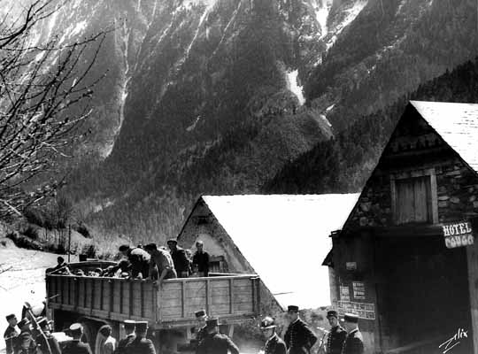 | Contenido: Traslado de refugiados frente al Hotel Fouga en Fabian en camiones hasta Saint Lary o Arreau. |