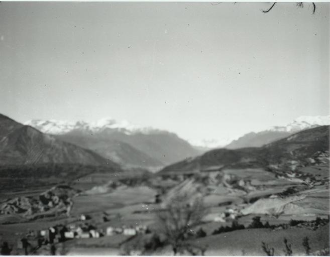Contenido: Vista panorámica de la localidad de Javierre del Obispo, donde el batallón mandado por Sobregrau permaneció hasta los días 16-17 de marzo, en que es trasladado a Sabiñánigo. \r\nEn el pueblo de Javierre se encontraba el puesto de mando del ejército franquista, mientras que sus posiciones estaban en los montes que rodean el valle. \r\nAntes de la llegada de las tropas mandadas por Sobregrau, el pueblo había estado 9 meses en poder del ejército republicano. Según su diario, la mayoría de las casas están quemadas a raíz de los combates de 9 meses atrás y queda muy poca gente en el pueblo. |