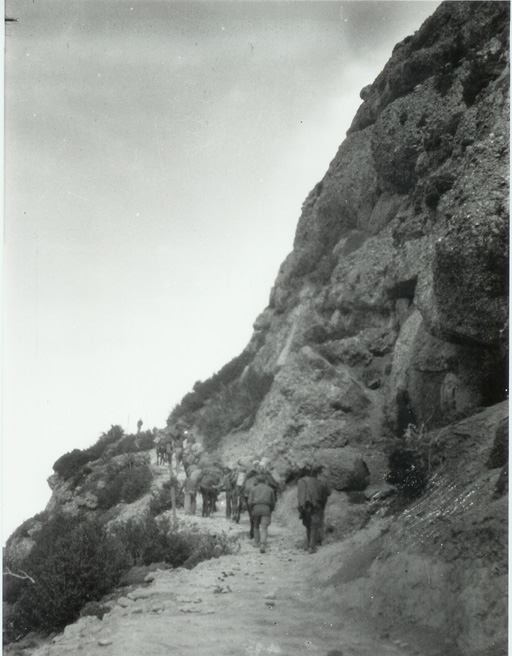 | Contenido: Batallón de Sobregrau, con mulos y ametralladoras pesadas, camino del llano de Santa Orosia, en el puerto de Yebra de Basa, desde Sabiñánigo, donde habían pasado algunos días tras abandonar las posiciones del valle del Gállego entre Sabiñánigo y Biescas. La fotografía está tomada en un punto muy próximo a la cima del puerto. |
