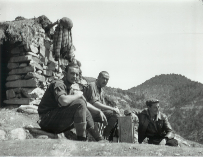 | Contenido: Retrato de tres soldados de la 3ª de Navarra sentados en los alrededores de la posición. |