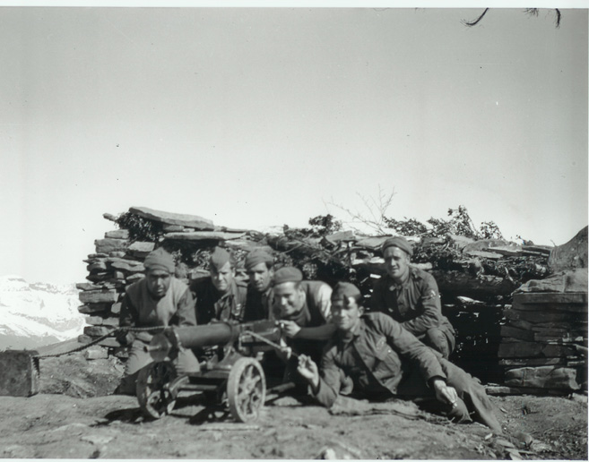 | Contenido: Fotografía en la que aparecen posando varios soldados con una ametralladora pesada en la posición que tenían destinada. |