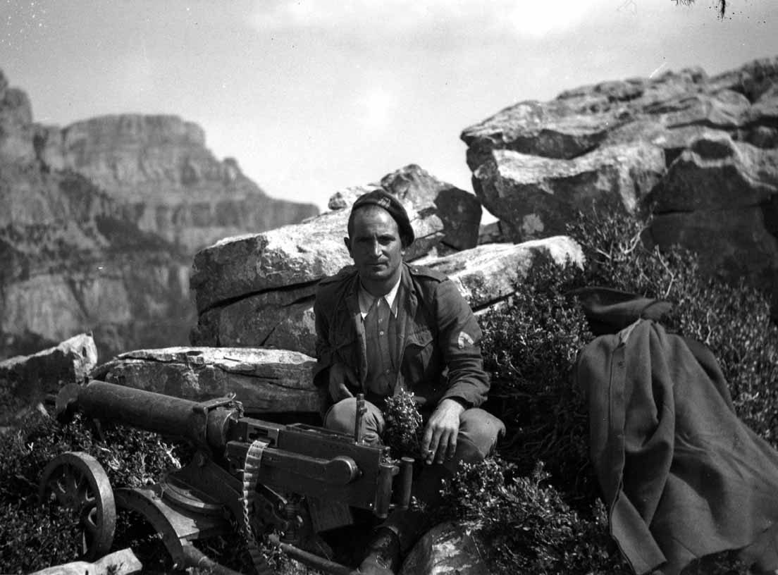| Contenido: Oficial junto a una ametralladora Maxim en una posición de control en el cañón de Añisclo.\r\nSobregrau anota con fecha 4 de junio la salida desde las posiciones de Puyarruego a Vio y, por la tarde, a Nerín, donde toman posiciones sobre el cañón de Añisclo. |