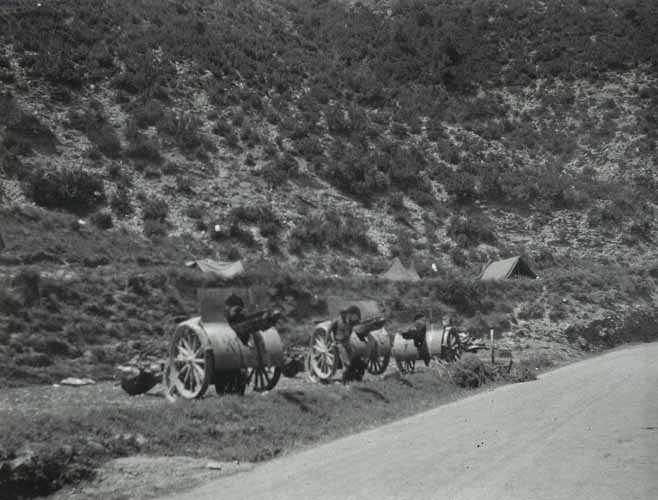 Contenido: Baterías emplazadas seguramente en el camino de acceso al pueblo de Puyarruego. \r\nCoincide con la entrada del diario de fecha 16 de junio: "A las 5 de la mañana iniciamos la marcha pasando por alturas de Puyarruego y por el pueblo, tomado pocos días antes. Yo tenía curiosidad por ver este pueblo que tantos dias nos tuvo entretenidos. Es un espectáculo salvaje. La vida de los milicianos rojos debe haber sido terrible. No hay una sola casa que no tenga miles de impactos. La mayoría están destrozadas por los obuses que han abierto las paredes. El suelo está lleno de trozos de metralla. Está fortificado en extremo, todo trinchera cubierta y las casas llenas de aspilleras. Ví donde cayó el camarada Antonio Torrecillas Perea a unos 6 o 7 m. del parapeto enemigo. [...]" |