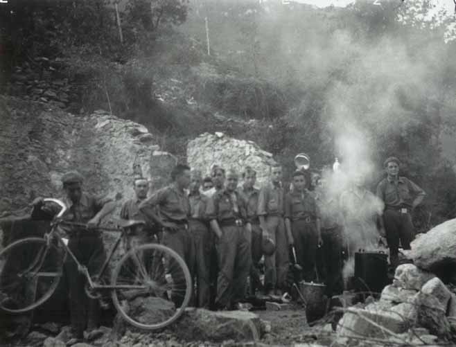 Contenido: Retrato de grupo de los soldados a la hora del rancho, seguramente en el camino hacia Bielsa. \r\nCoincide con la entrada del diario de fecha 17 de junio: "El Generalísimo nos ha concedido la Medalla Militar Colectiva por la actuación en esta bolsa a todos los que han operado. Por la tarde vamos a visitar la central de Lafortunada que los rojos han destruido. Después seguimos hacia arriba, hacia Bielsa. El paisaje es cada vez más pirenaico y más bonito. No se parece en nada al tramo del valle de Fanlo. [...] De Bielsa, que era un pueblo grandote, ni una sola casa. Todo, completamente todo, ha sido derruido.[...]" |