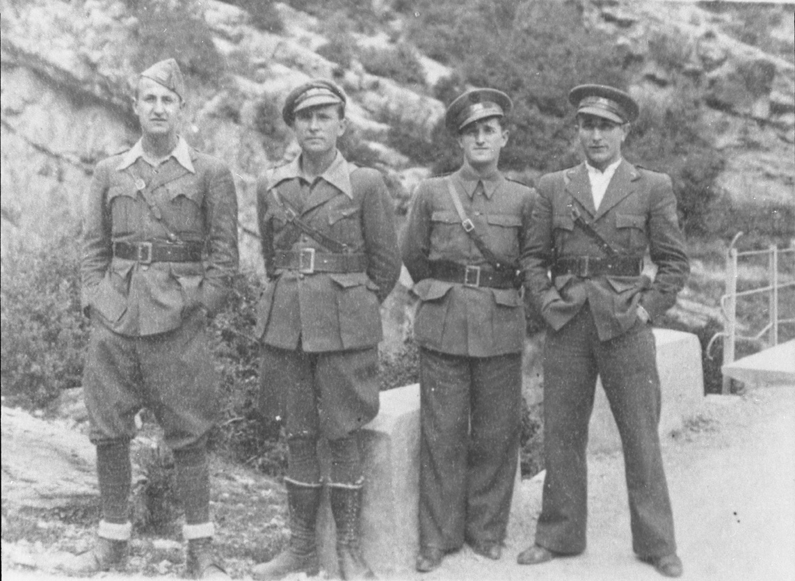 | Contenido: De izquierda a derecha: Ramón Castejón, jefe de Estado Mayor de la 130ª Brigada Mixta; Juan Lacasa Lardiés, al mando de la 130 Brigada Mixta.; Lorenzo Berdala, comisario de la 130 Brigada Mixta.; y José Sampietro, capitán de la 130 Brigada Mixta. |