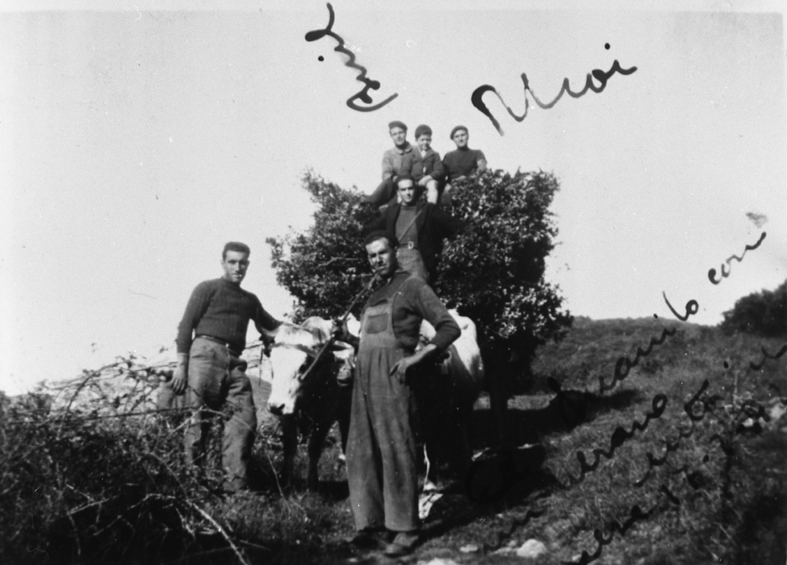Contenido: Fotografía de un grupo sin identificar con un buey cargando forraje. En la fotografía está escrito en la parte inferior derecha: "A Juanito con un abrazo [...] 17-2-42". En la parte superior: "Buil" y a la derecha: "moi". |