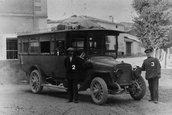 | Contenido: Fotografía tomada en uno de los autocares de la compañía La Competencia. Antonio Beltrán en el interior del vehículo; fuera, junto a la portezuela, Francisco Cavero, el taxista de Canfranc; a la derecha el jefe de la estación de Jaca. |