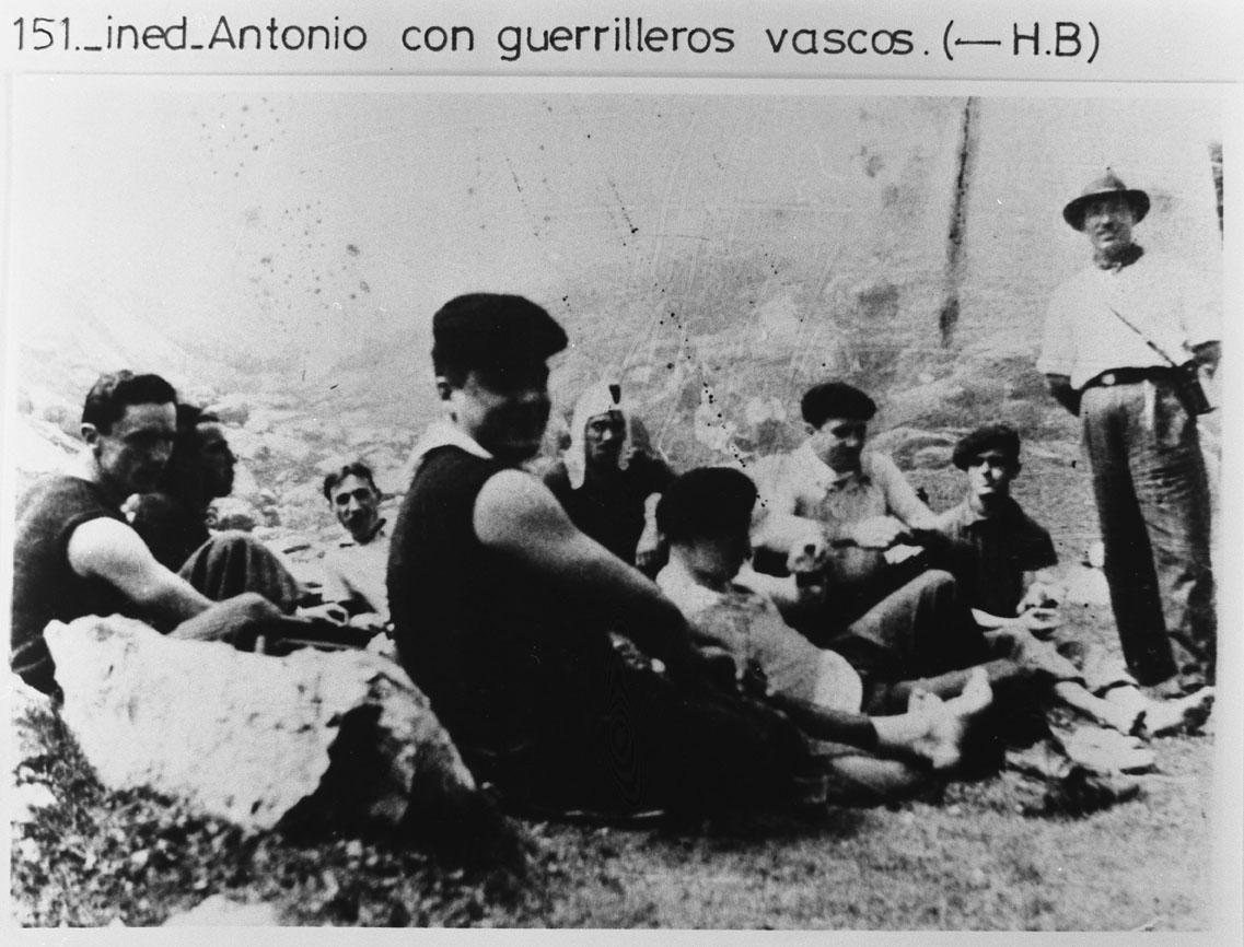 | Nota: Antonio Beltrán escribió al pie de la foto el texto que da título a la foto, "Antonio con guerrilleros vascos", y las letras H. B. (Hilario Borau, seguramente), que deben responder bien al autor de la fotografia o a su procedencia. |