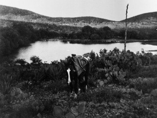 | Contenido: Fotografía tomada en un paraje del rancho Canfranc, Matehuala, estado de San Luis de Potosí, propiedad de Lázaro Beltrán, que cede la explotación al Esquinazau. Aquí vivirá Antonio Beltrán hasta su muerte en 1960. |