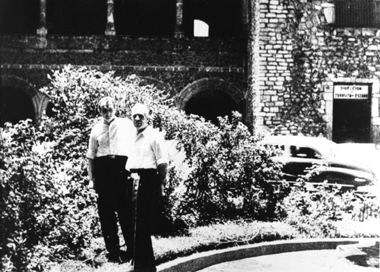 En otro negativo aparece una leyenda semicortada que parece corresponder a esta foto: "216. Con Ramón Beltrán. Ante el palacio de Hernán Cortés en Cuernavaca". |