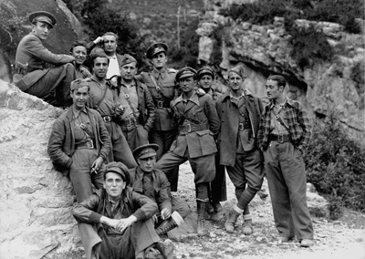Sentado sobre la piedra, el capitán José Sampietro; a su lado, Máximo Gracia; en último término, con el puño en alto, Lorenzo San Román, miliciano de Biescas. En la fila del centro, apoyado en la piedra, oficial sin identificar; trás él Ramoné del Fort, de Biescas; el siguiente, el oficial pagador, de Caspe; en el centro, Lorenzo Berdala, comisario político y maestro; a su lado, Juan Lacasa; junto a él, Emilio Gimeno Aznárez, de Hecho; el siguiente, Ramón Castejón Crespo, maestro de Villanovilla y jefe de Estado Mayor de la Brigada; con camisa de cuadros, Miguel Turrau Sola, maestro. Sentado en primera línea, Hilario Borau; detrás de él, también sentado, el capitán Anguita, jefe del XIV Cuerpo Especial de Operaciones (destrucciones). |