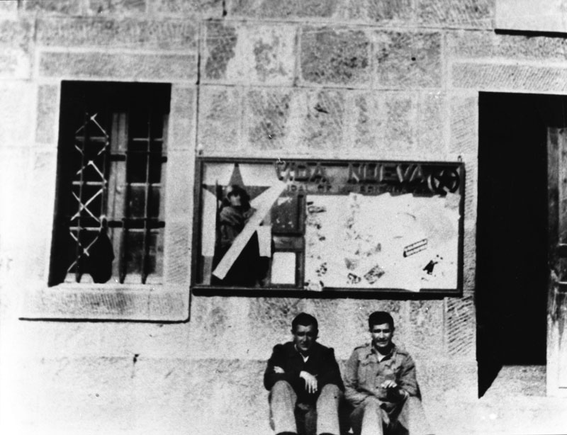 | Nota: En la copia de 18 x 24 cm, nota pegada en el reverso: "Sentados bajo el mural del P. M. de la 72 B. M." |