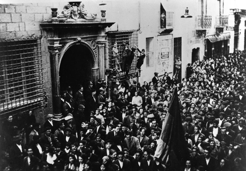 | Contenido: Concentración de jacetanos en la calle Mayor, ante el ayuntamiento, celebrando la proclamación de la República. Los presos civiles, que fueron detenidos en la sublevación de 12 de diciembre de 1930, fueron liberados y conducidos al ayuntamiento. |