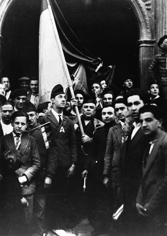 | Contenido: Grupo con gorro y bandera republicanos ante la puerta del ayuntamiento durante las celebraciones del día siguiente a la proclamación de la Segunda República. El que porta la bandera es Domingo Bandrés; a la izquierda, con traje, corbata y gorro frigio, Hilario Tiznel; a la derecha del primero, en un plano más adelantado, Justo Mañé; y, empezando por la derecha de la fotografía, el segundo, Ricardo Ger. |