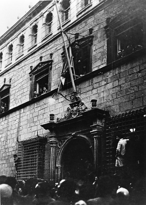 | Contenido: Ricardo Zabalza Elorga izando la bandera republicana en la fachada del ayuntamiento de Jaca. |