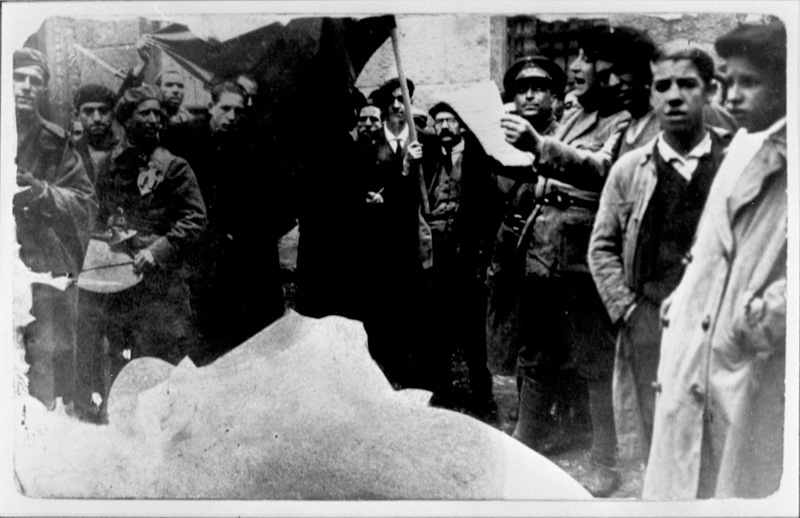 | Contenido: El bando redactado por Galán es leído en las calles de Jaca por Alfonso Rodríguez, El Relojero. Tras él asoma la cabeza de Miguel Gallo, entonces capitán de infantería. |