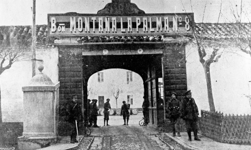 | Contenido: Pie de foto: "El cuartel en que se alojaba el batallón de La Palma, que se unió al regimiento de Galicia en la sublevación. Foto de nuestro corresponsal en Zaragoza señor Martínez." |