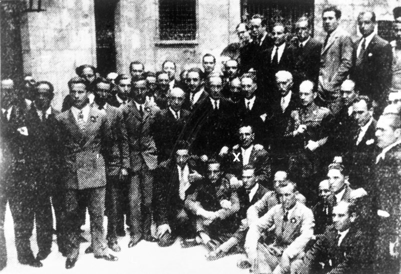 El que esta señalado con una X es Antonio Beltrán; apoyando las manos sobre sus hombros, Lluís Companys, gobernador civil; al lado, a la derecha de éste, Francesc Macià, presidente de la Generalitat; Pío Díaz Pradas es el que está hacia el centro, detrás del último personaje arrodillado de la primera fila. |