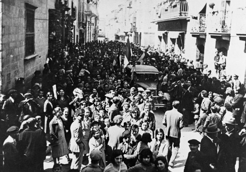 Contenido: Vista de la calle Mayor de Jaca durante las celebraciones y manifestaciones que tuvieron lugar al día siguiente de la proclamación de la Segunda República.