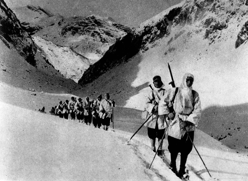 | Contenido: Sección de Esquiadores del Batallón Mixto de Montaña del ejército franquista durante un patrulla por el Pirineo oscense. |