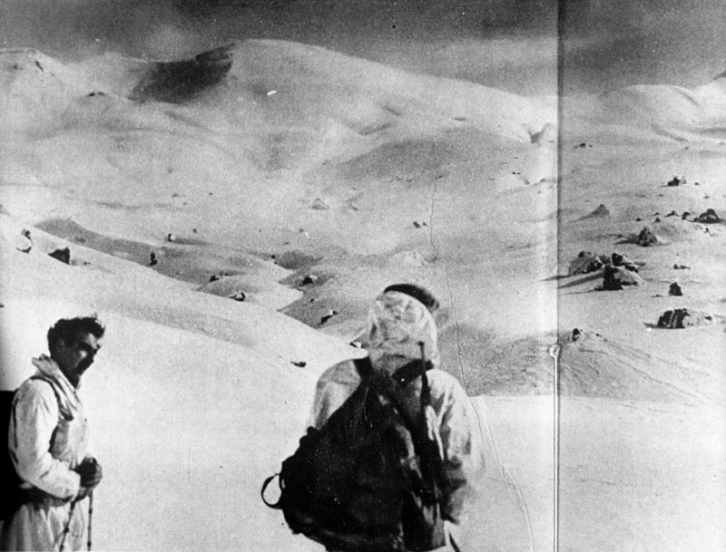 | Contenido: Sección de Esquiadores del Batallón Mixto de Montaña del ejército franquista durante un patrulla por el Pirineo oscense. |