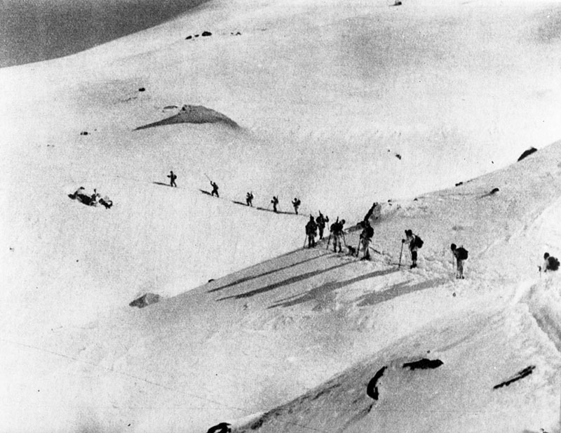 | Contenido: Sección de Esquiadores del Batallón Mixto de Montaña del ejército franquista durante un patrulla por el Pirineo oscense. |