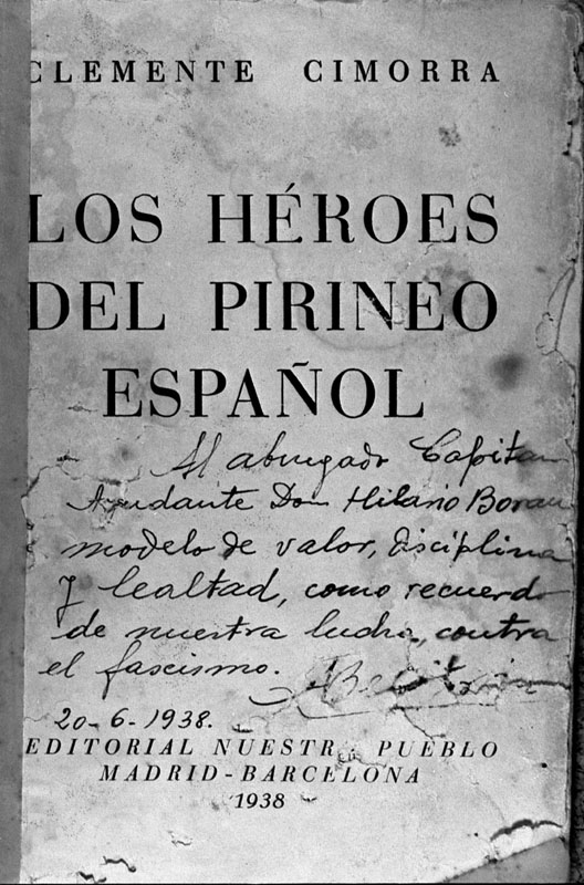 | Contenido: Portada del libro de Clemente Simorra, Los héroes del Pirineo español, Madrid - Barcelona, Editorial Nuestro Pueblo, 1938, con la siguiente anotación manuscrita: "Al abnegado capitan ayudante, don Hilario Borau, modelo de valor, disciplina y lealtad, como recuerdo de nuestra lucha contra el fascismo. Beltrán [firma] 20-6-1938". |