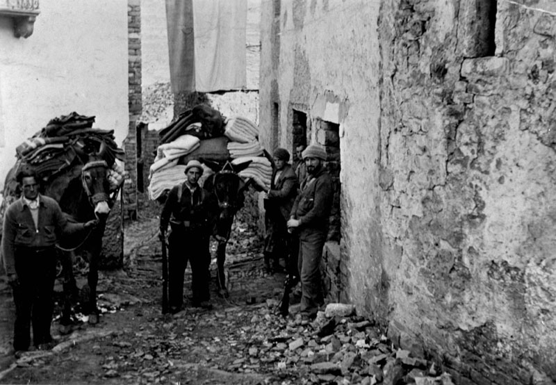 | Contenido: Grupo de mulas transportando mantas con destino a los combatientes de la 43 División. |