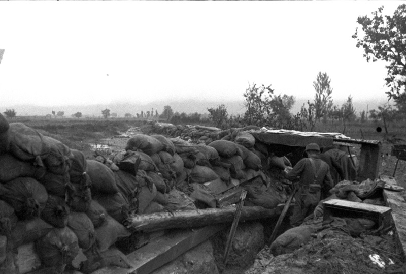 | Contenido: Descripción en ANC: "Combatientes republicanos detrás de una trinchera y casas destruidas por un bombardeo en Casetas de Quicena, frente de Aragón". |