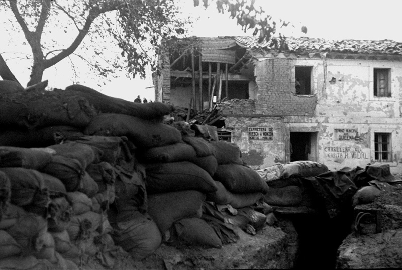 | Contenido: Descripción en ANC: "Combatientes republicanos detrás de una trinchera y casas destruidas por un bombardeo en Casetas de Quicena, frente de Aragón". |