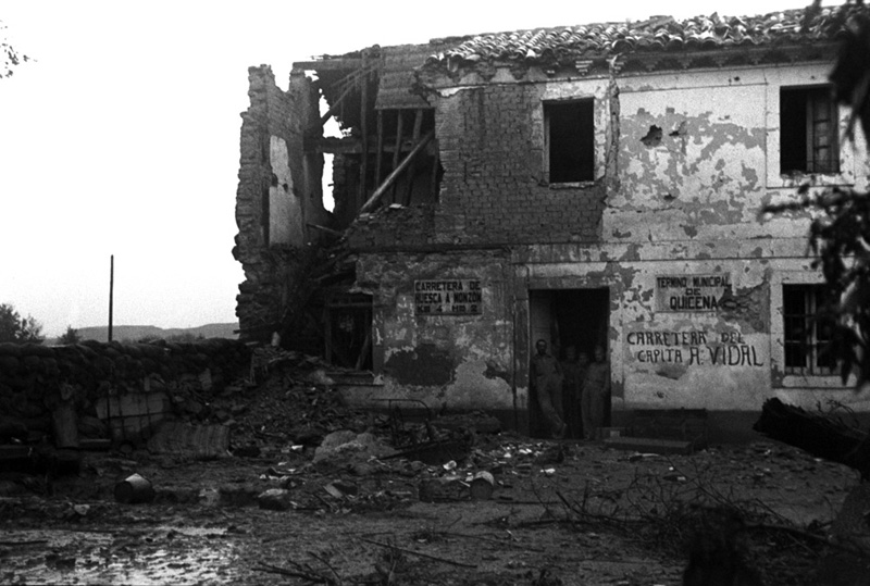 | Contenido: Descripción en ANC: "Combatientes republicanos detrás de una trinchera y casas destruidas por un bombardeo en Casetas de Quicena, frente de Aragón". |