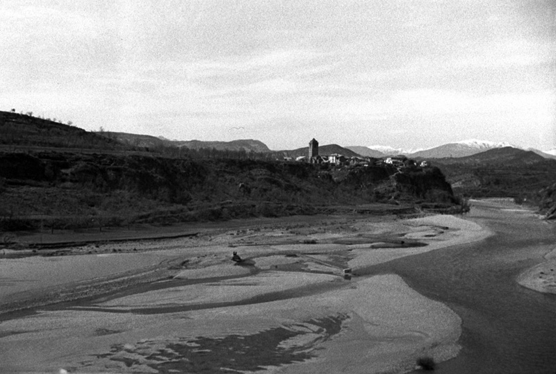 Descripción en ANC: "Combatientes republicanos, población y pantano de Mediano, frente de Aragón". |
