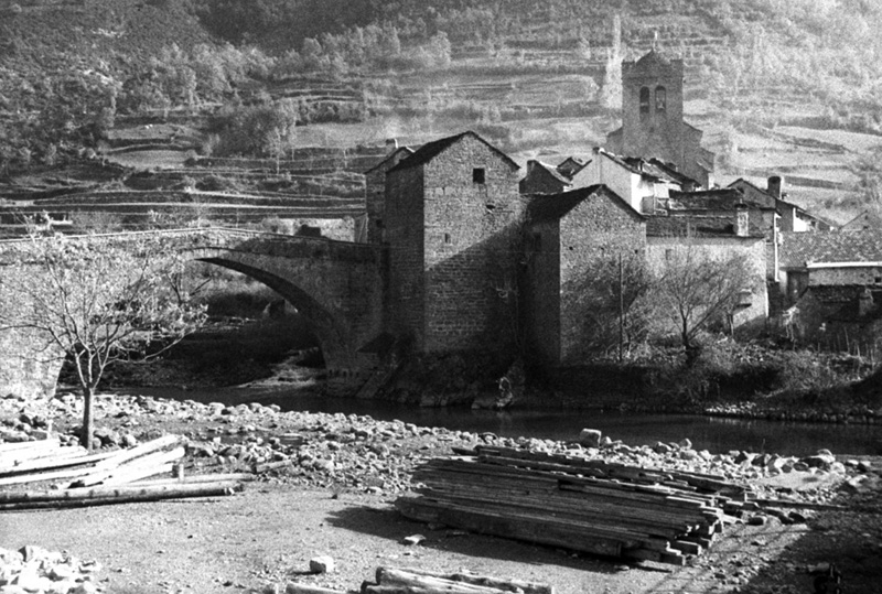 Contenido: Como edificios de interés aparecen en la fotografía el puente sobre el río Ara (volado en 1938), la torre de la cárcel junto al puente, la sede de la junta del valle (también destruida) y la iglesia, así como algunas de las casas del núcleo.