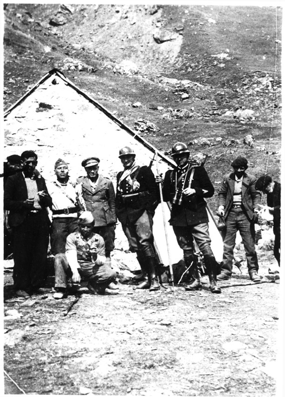 | Contenido: Militares de la 43 División y población civil posando con gendarmes durante la retirada. |