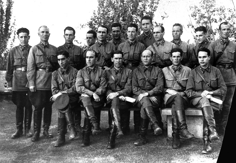 | Contenido: Antiguos oficiales del ejército de la República y miembros del PCE en la Academia del Ejército Rojo M. V. Frunze (Moscú). El segundo, empezando por la izquierda es Antonio Beltrán; otros personajes destacados que aprecen son Manel Tagüeña, el más alto de la fila del fondo, Pedro Mateo Merino, Artemio Precioso, Francisco Romero Marín y Líster. |